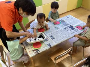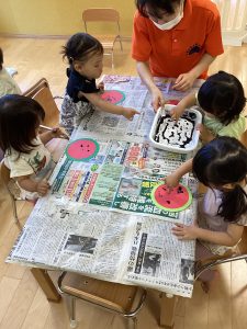 いちご組さんは指に絵の具をつけてスイカの種をつけていますね🍉