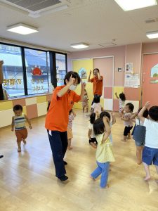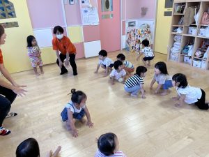続いてピアノの音に合わせた動物になりきって身体を動かします🐸