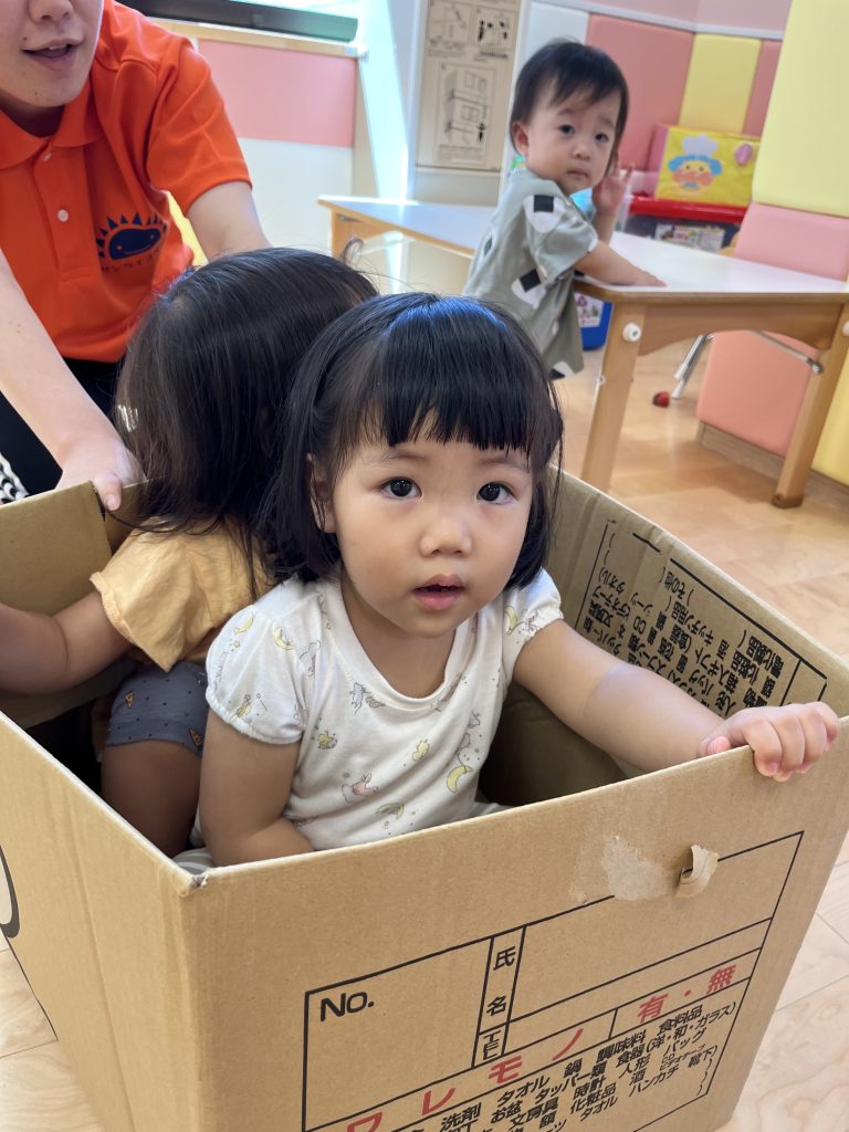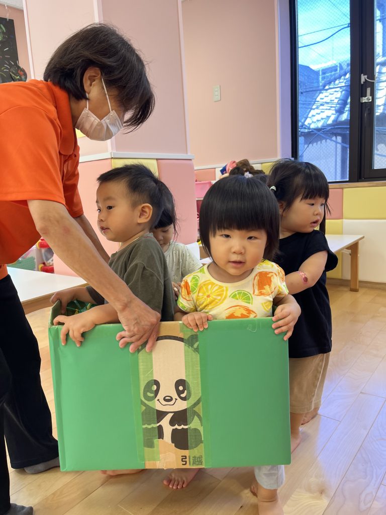 ダンボールの電車ではお友だちや保育士と協力して持ち上げて歩いて楽しんでいましたよ🚃