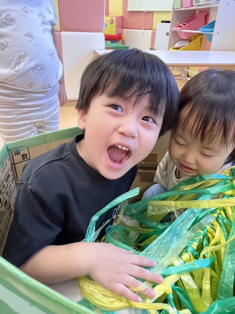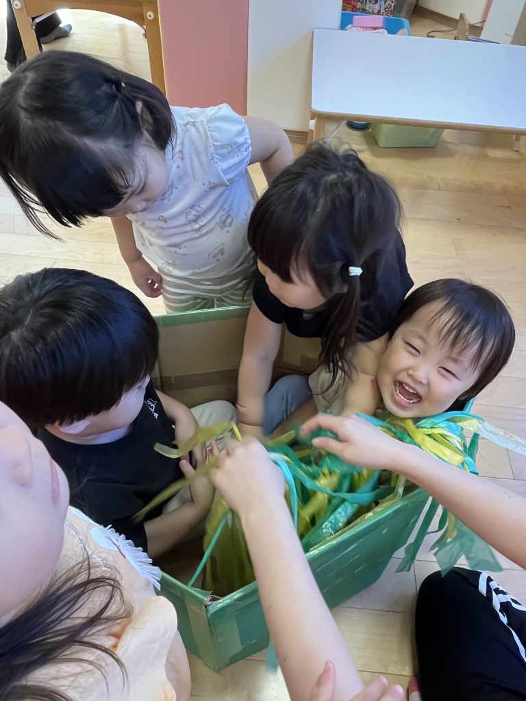ダンボールのお風呂ではお友だちと一緒にスズランテープをシャワーに見立てて遊んでいたり「気持ちいいね♡」「温かいね」と会話を楽しんでいた微笑ましい姿もありましたよ🛀
