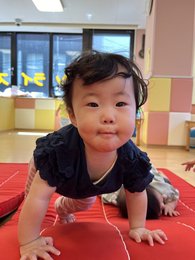 保育士が「ころころ〜」と転がすと、もう一回!と言わんばかりにハイハイやくまさん歩きでお山を登るお友だち🐻何度も繰り返し上り下りを楽しんでいました!