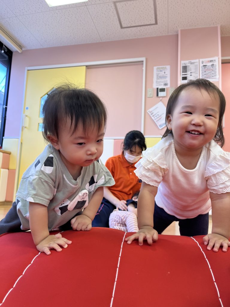 保育士が「ころころ〜」と転がすと、もう一回!と言わんばかりにハイハイやくまさん歩きでお山を登るお友だち🐻何度も繰り返し上り下りを楽しんでいました!