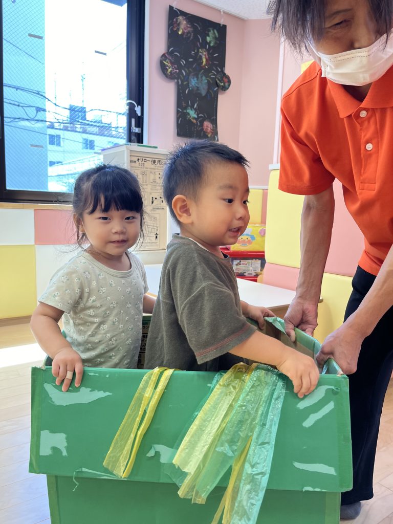 ダンボールの電車ではお友だちや保育士と協力して持ち上げて歩いて楽しんでいましたよ🚃