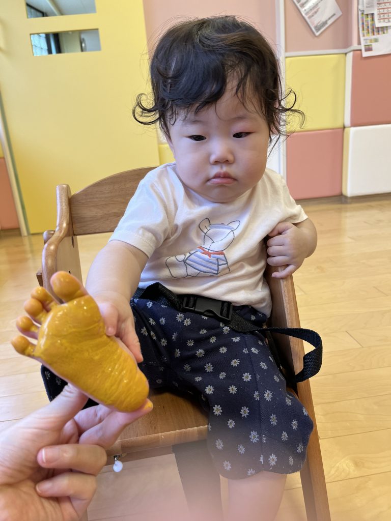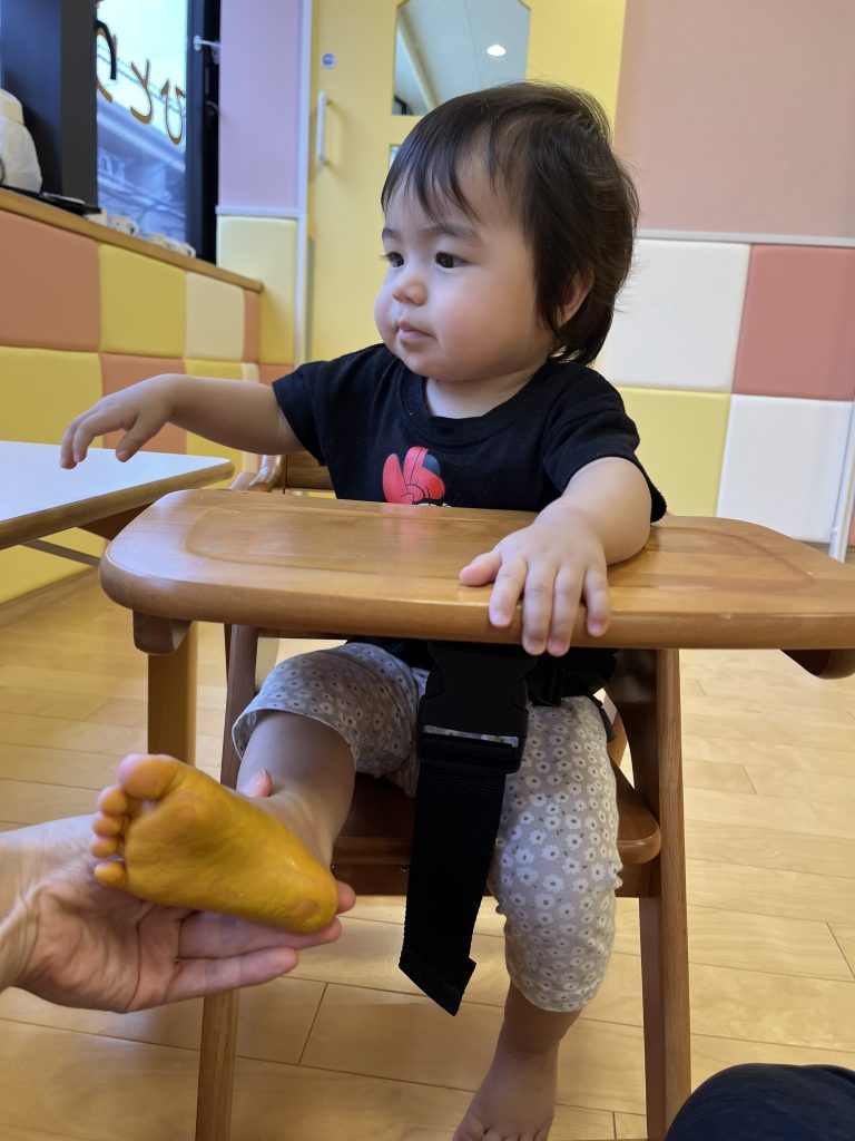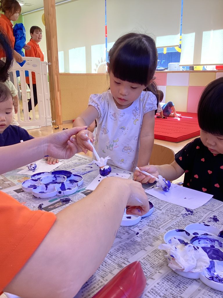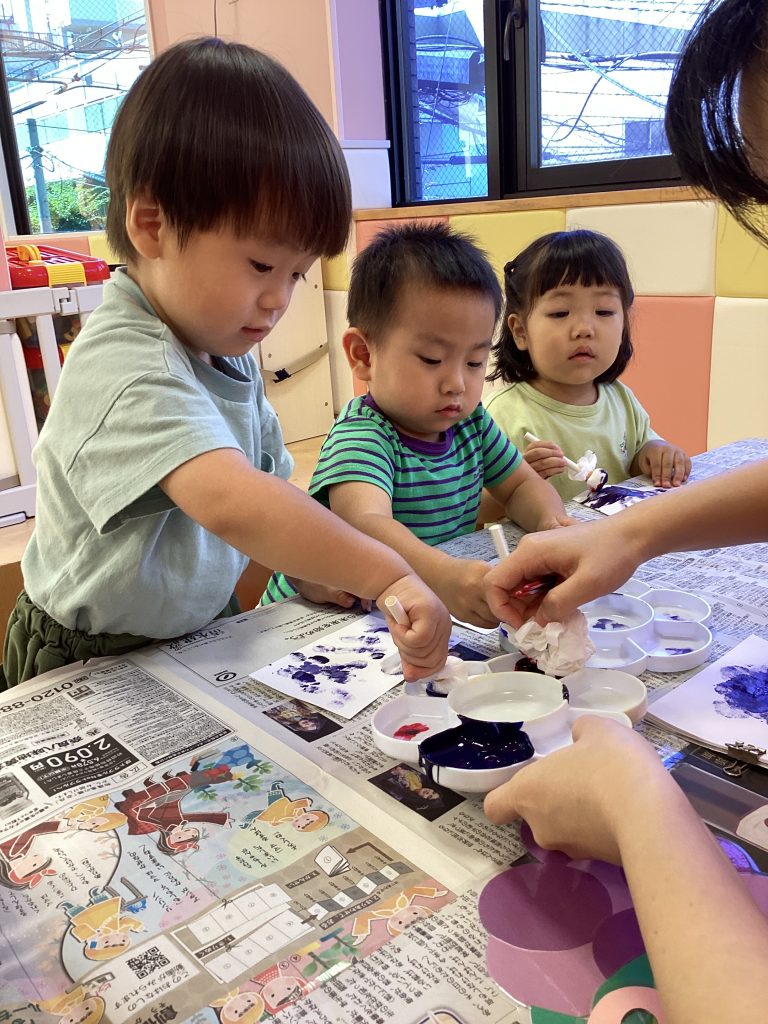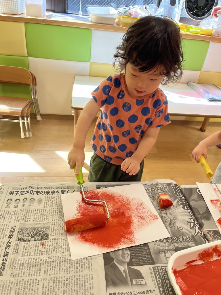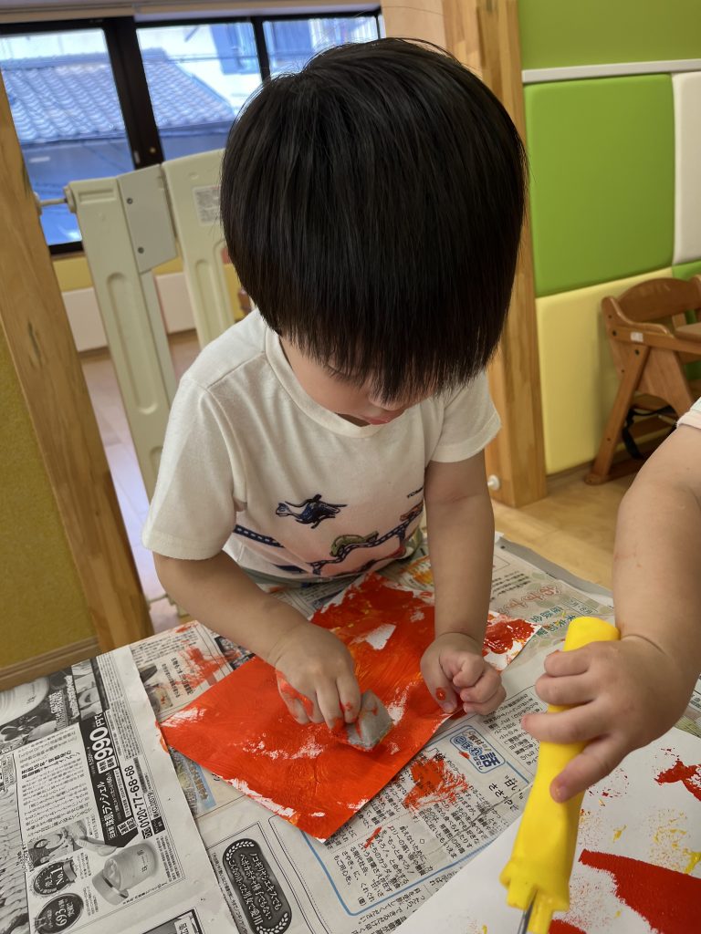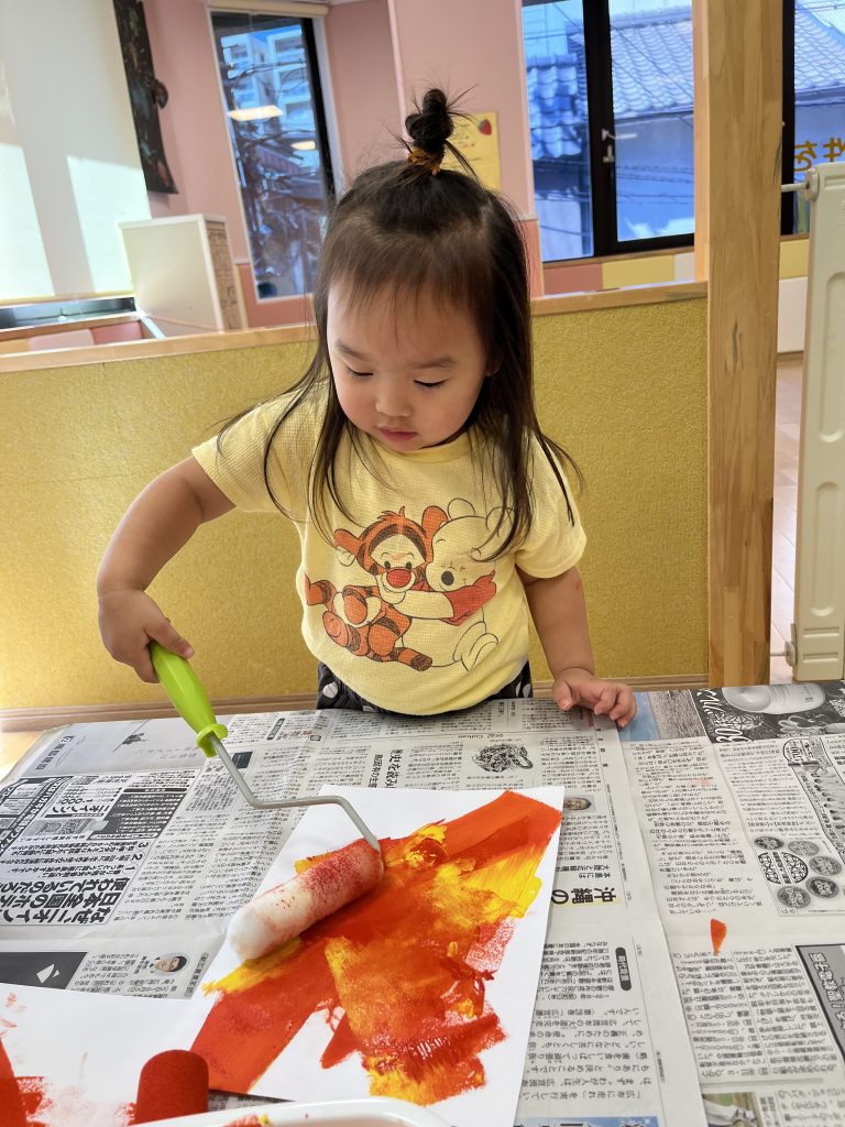 絵の具遊びが好きなりんご組のお友だちは紙一面がしっかり埋まるくらい集中して取り組んでくれていました👏