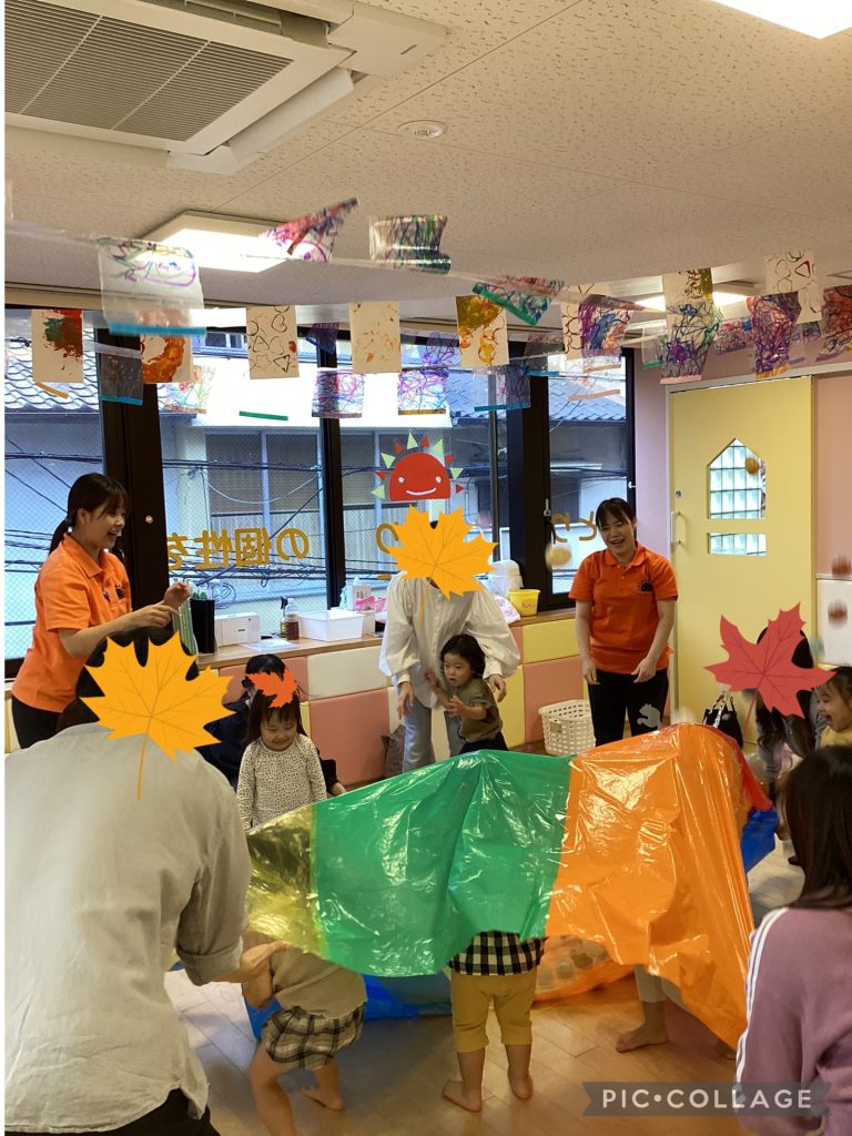 お母さん、お父さんに協力していただき手作りパラバルーンで遊びました✨