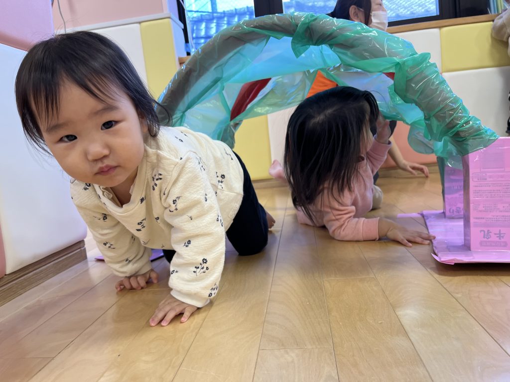 トンネルを潜ってハイハイをしたり、緑色のビニールが気になって覗く姿もありますね👀