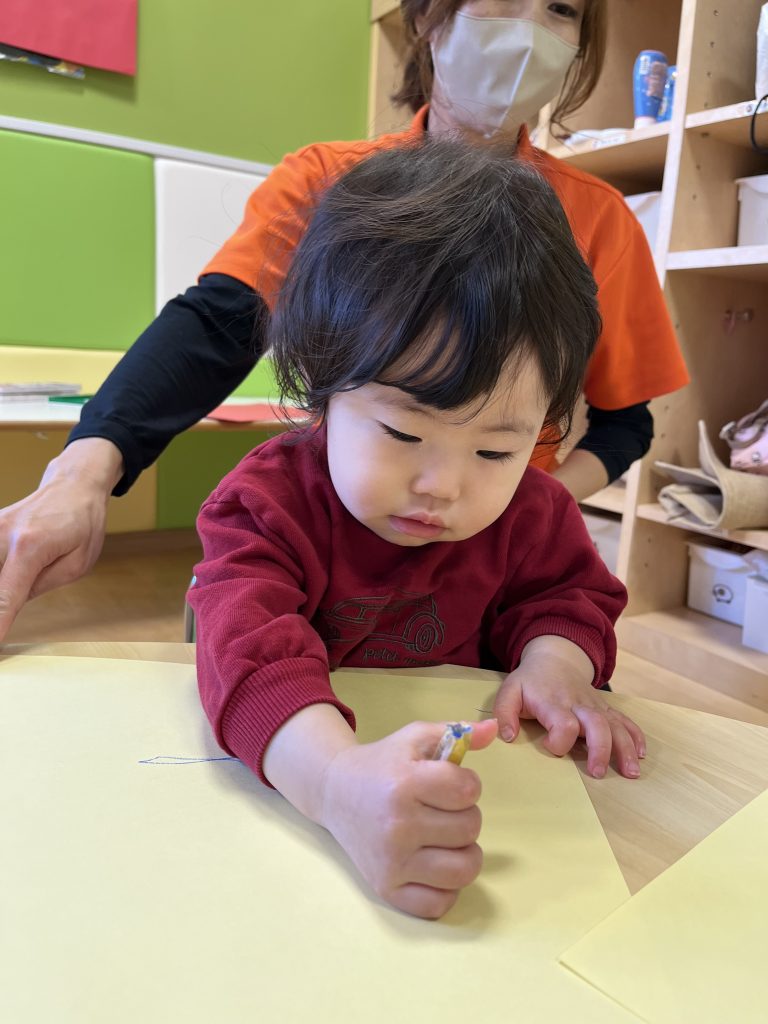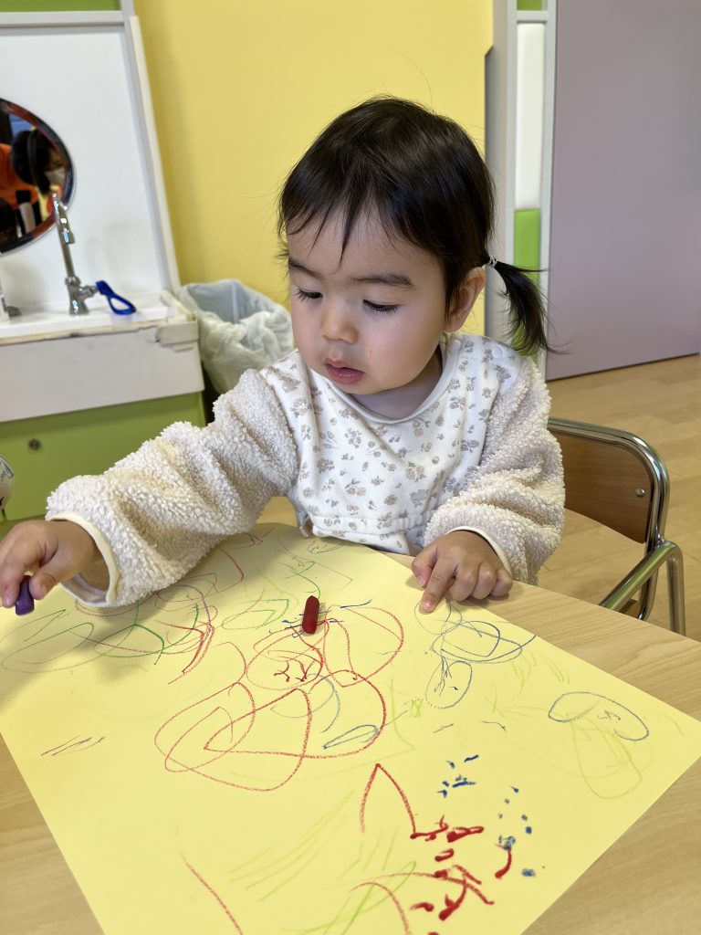 しっかりクレヨンを握って力強くなぐり描きを楽しんでいます✨