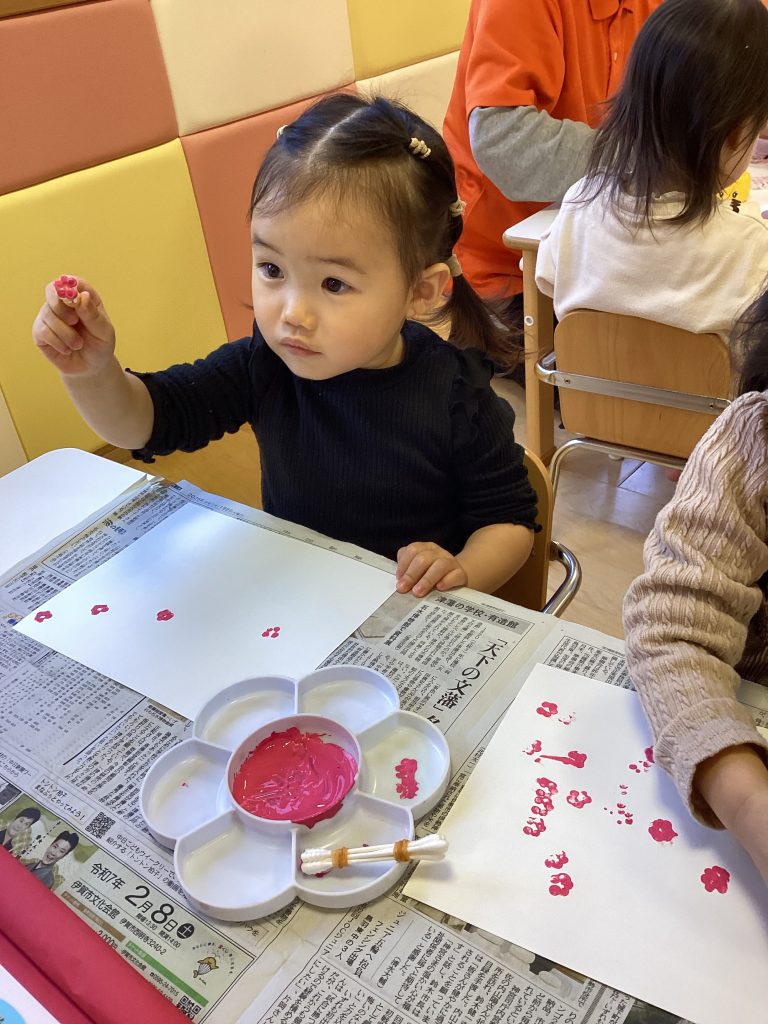 綿棒をスタンプすることで桃の花を表現するいちご組さん🌸
