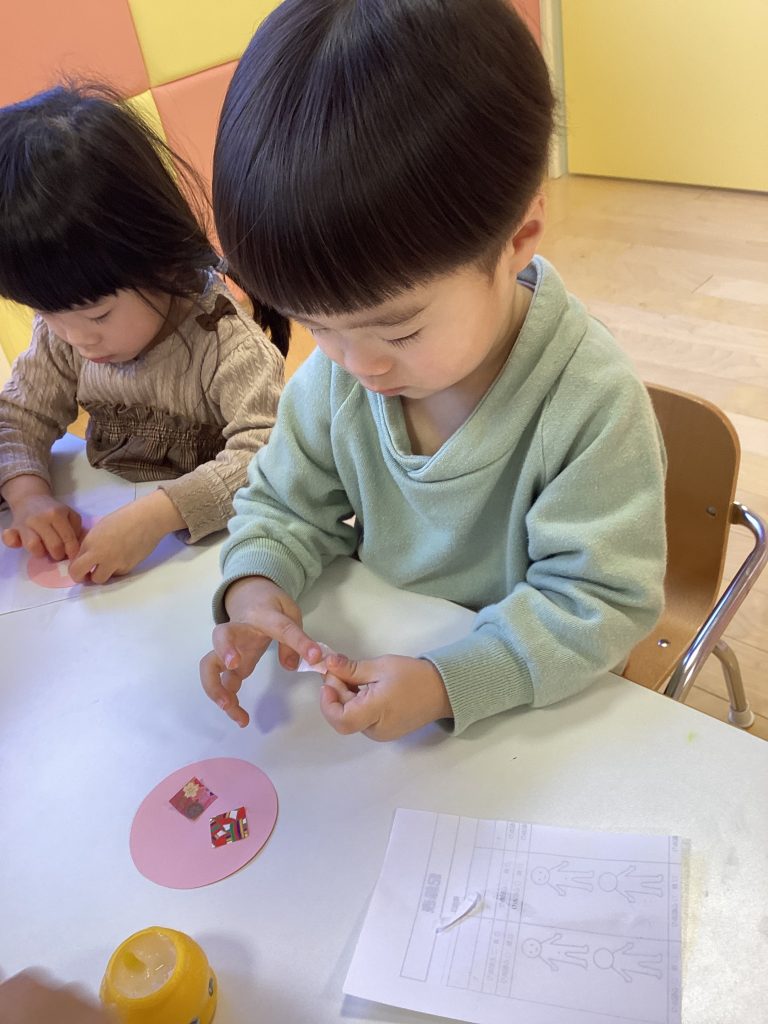 次に折り紙を糊で貼ります!指先を器用に使って塗り塗りする子どもたち👦
