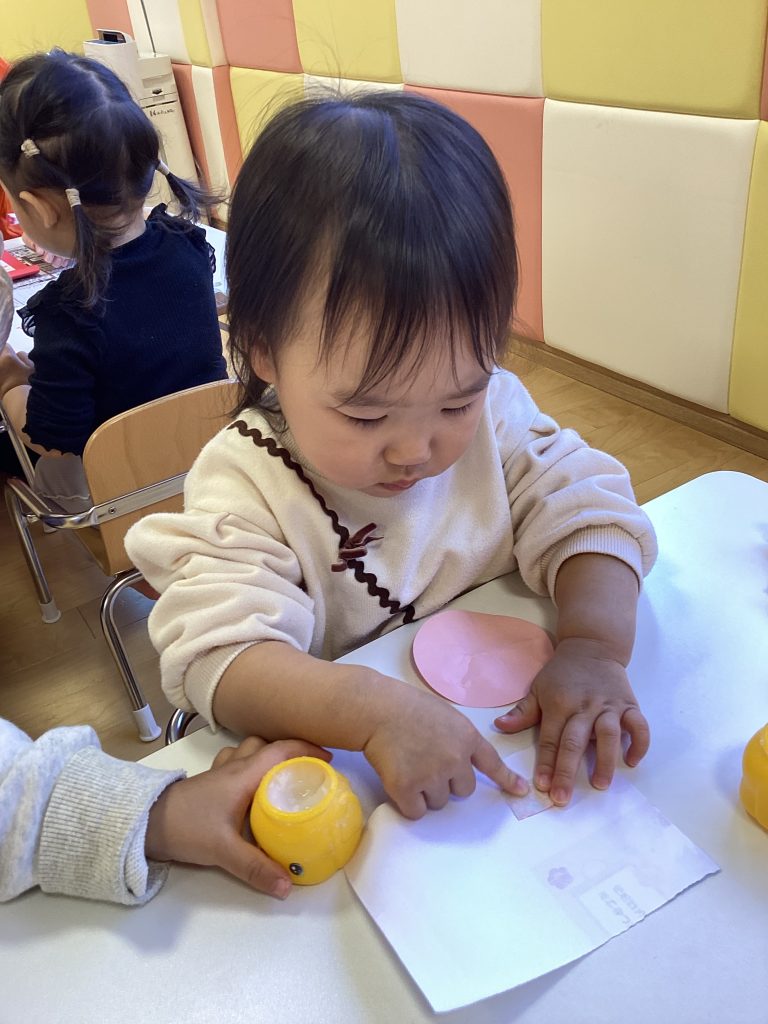 綿棒をスタンプすることで桃の花を表現するいちご組さん🌸