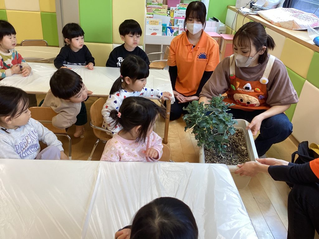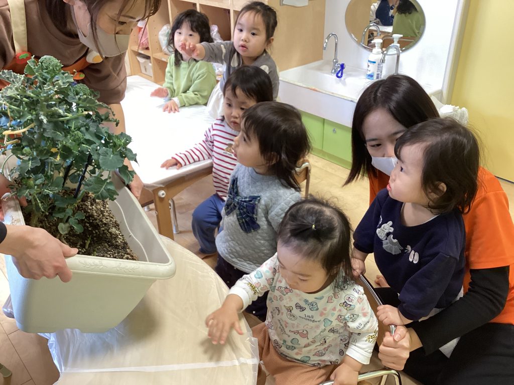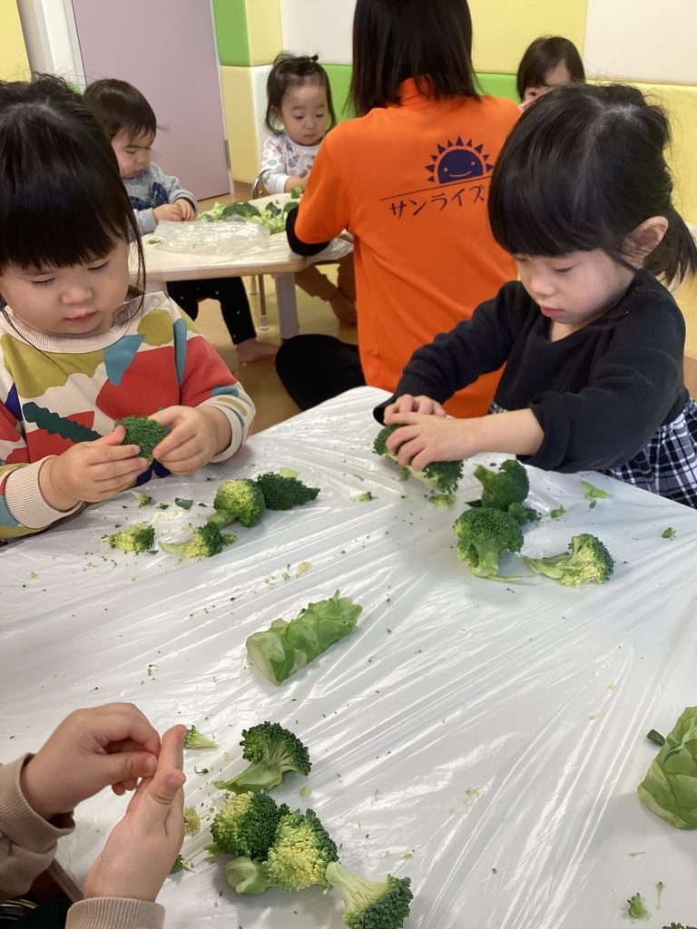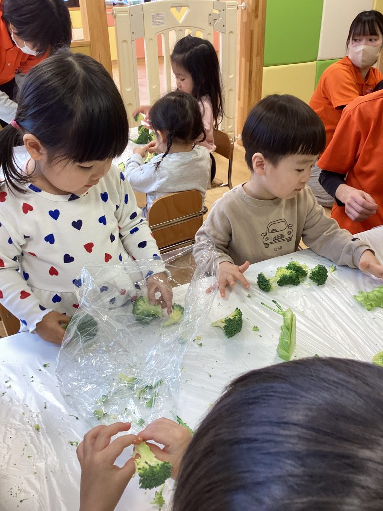 今回は収穫はせずにスーパーのブロッコリーを小さくちぎって給食先生のお手伝いを子どもたちにお願いすると、「いいよ〜」「小さくするの得意!」と張り切っていました🌟