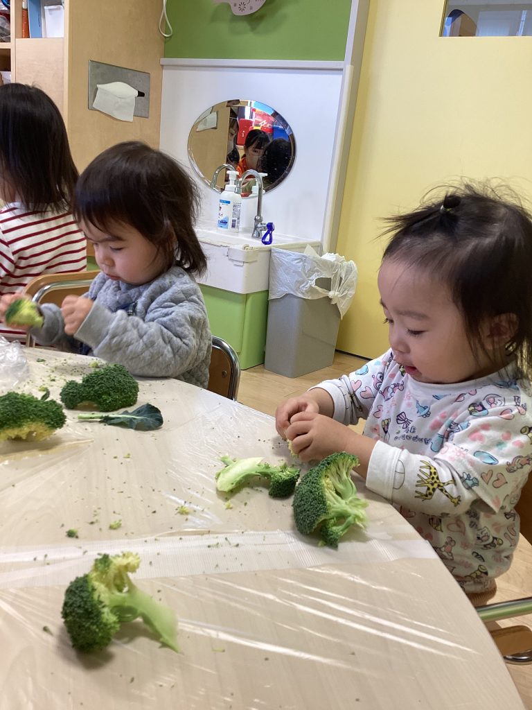 茹でていないブロッコリーは思ったよりも固かったようで、「かたいよ〜」「先生手伝って〜」と一生懸命に小さくしようと頑張っていました😆