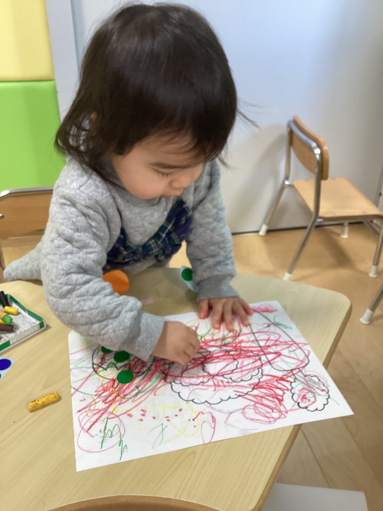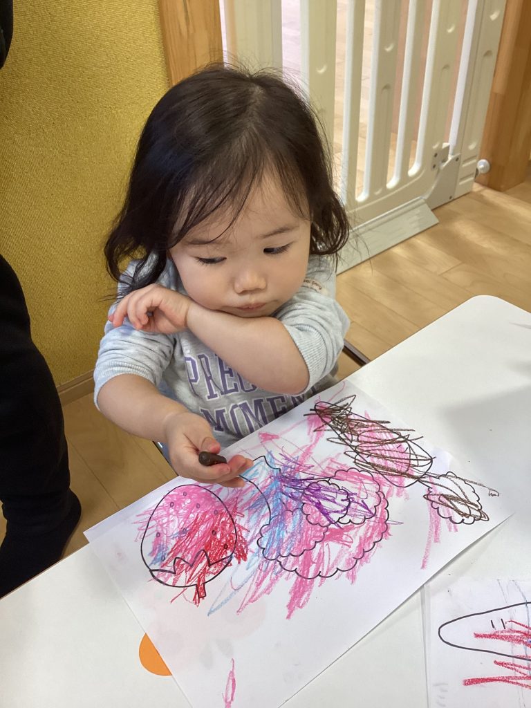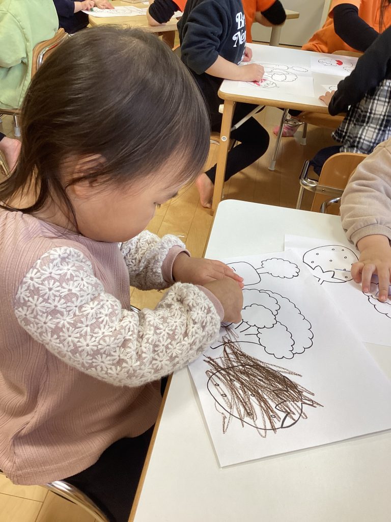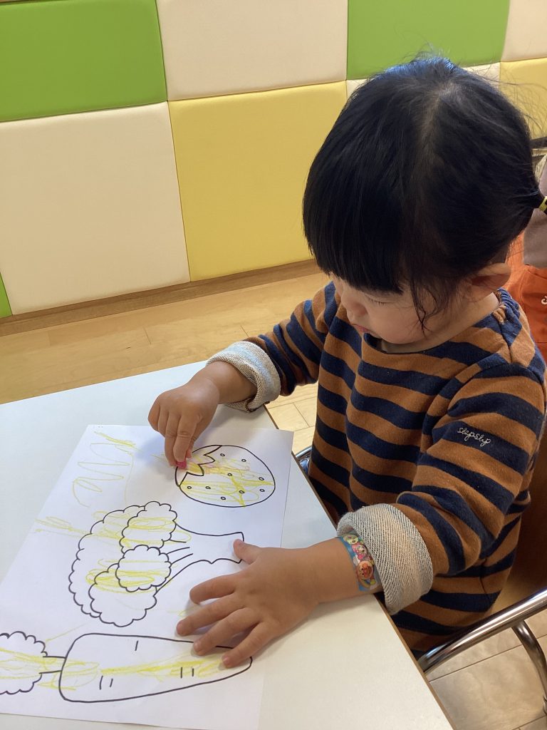 上手にちぎったブロッコリーを給食室まで運んだ後は、ブロッコリーを含めた野菜の塗り絵をしました♪