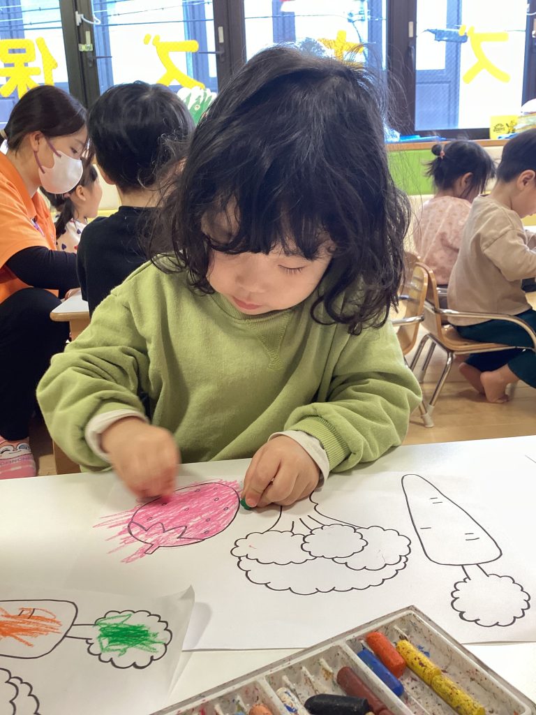 それぞれが好きな色を使って塗ったり、お野菜の色を想像しながら塗ったりと様々な姿が見られ、今回も楽しい食育活動となりました!