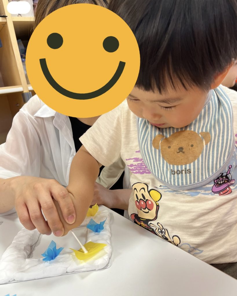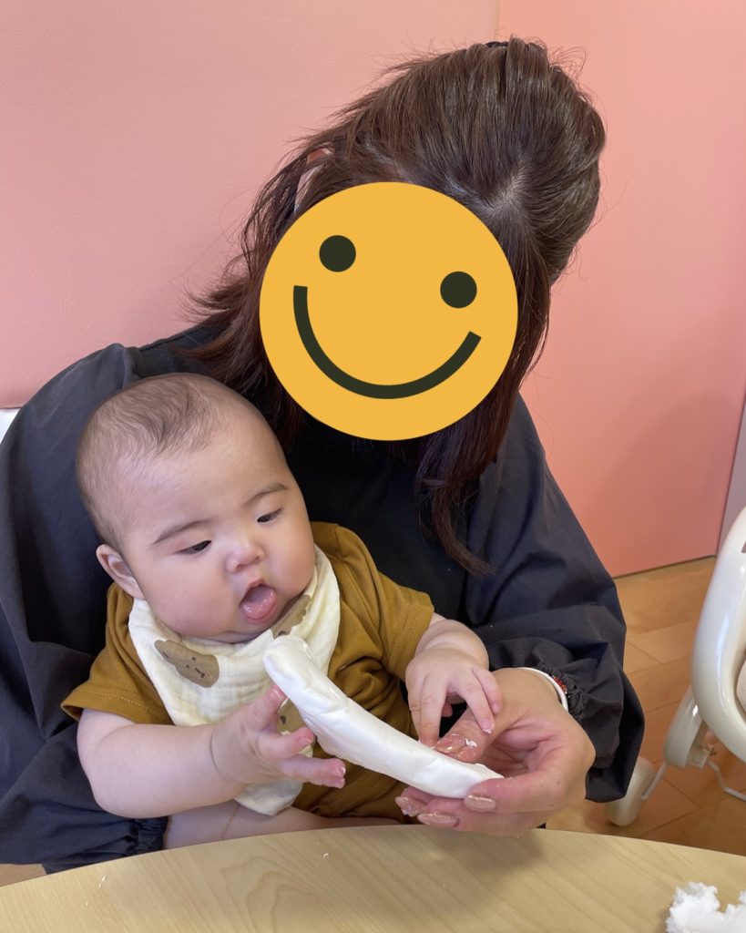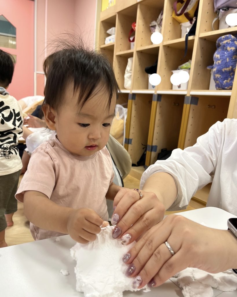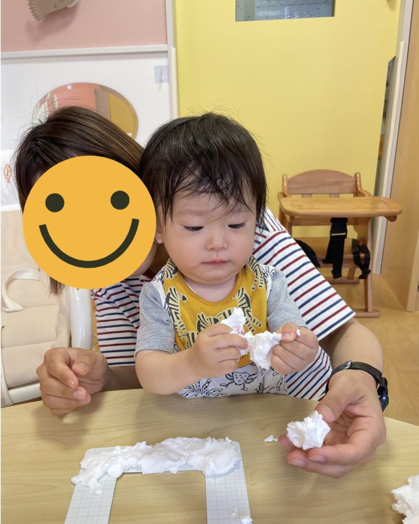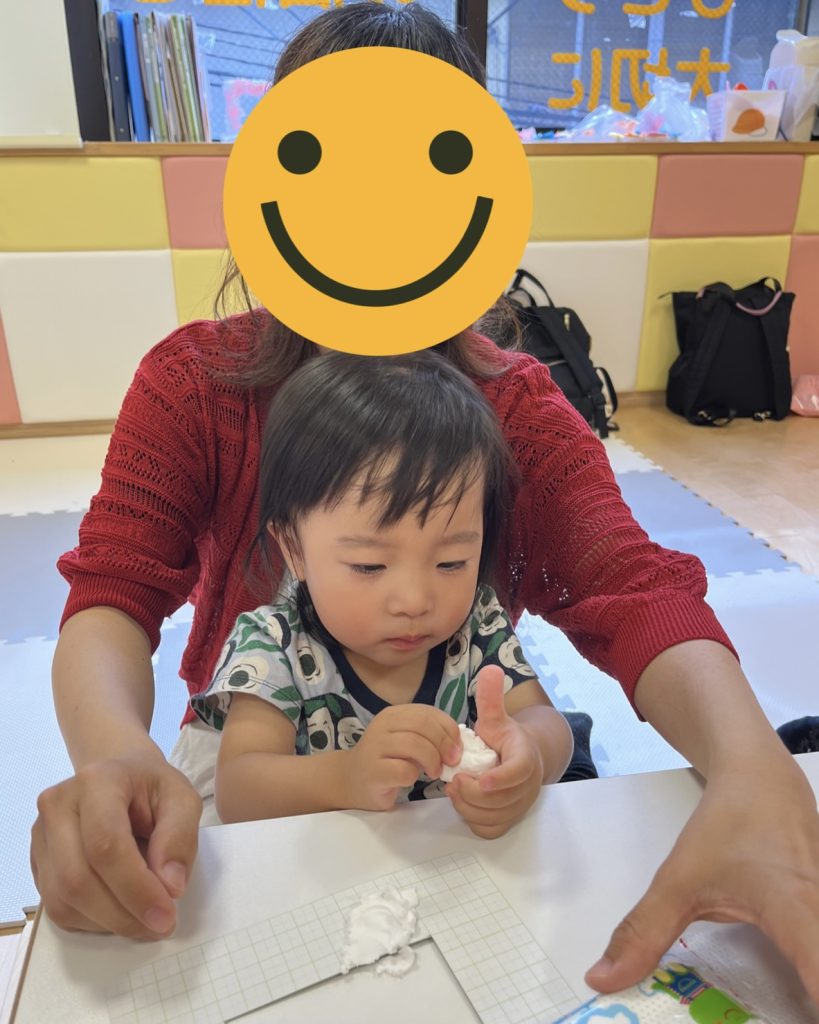 紙粘土のふわふわの感触を楽しむお友だち👶