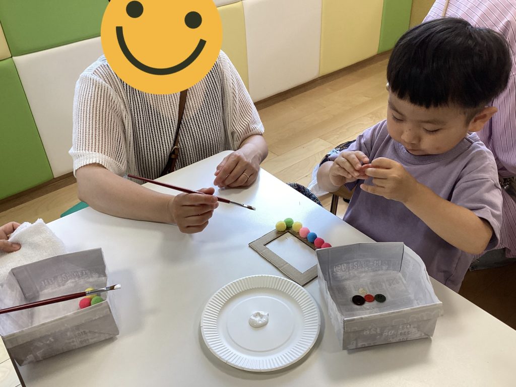 筆でボンドを塗り塗り🖌️ボタンやポンポンといった飾り付けを楽しみました😊