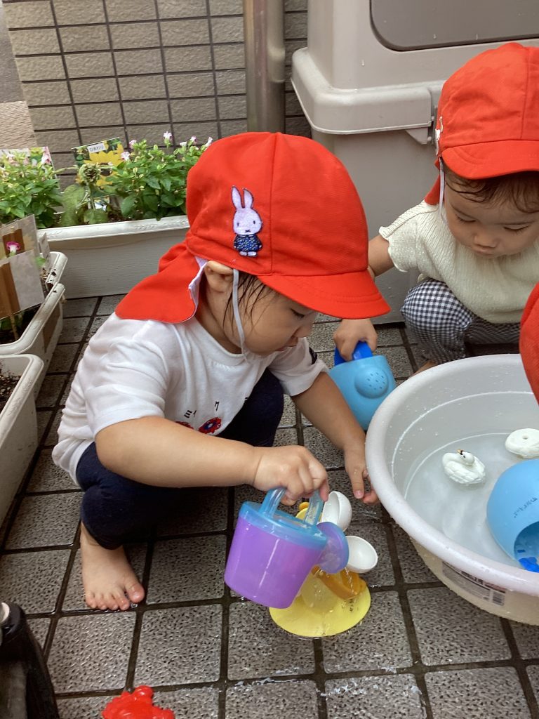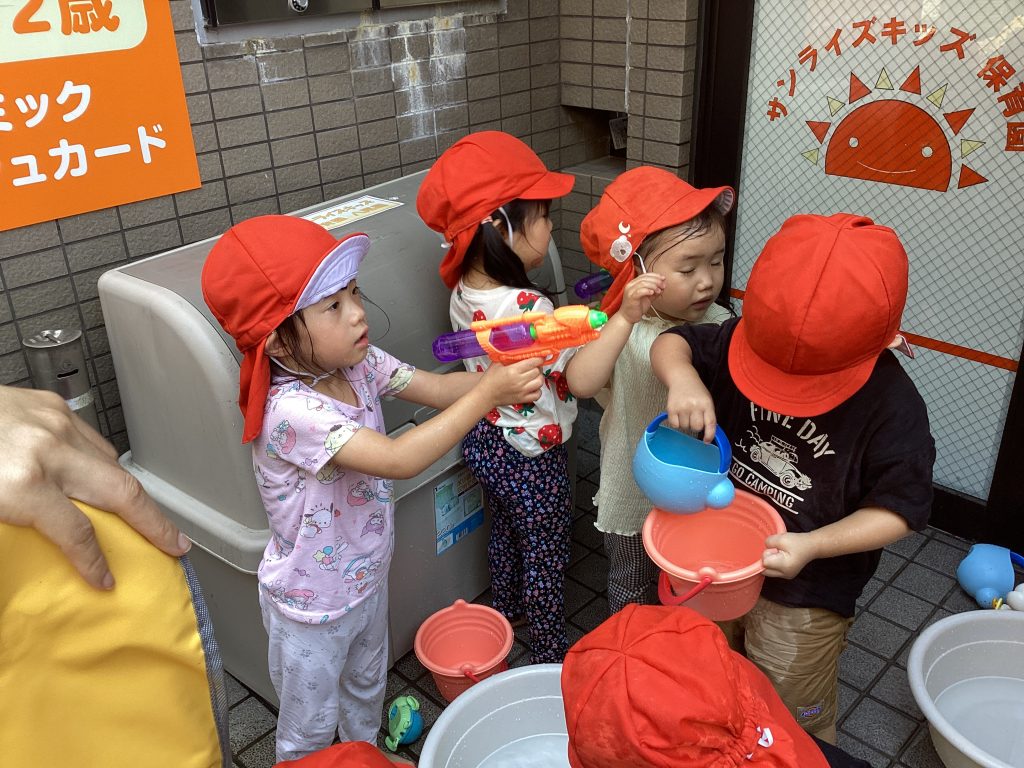ジョウロを使って水を移し替えたり、水鉄砲でお友だちや先生に掛け合って遊んでいます😄
