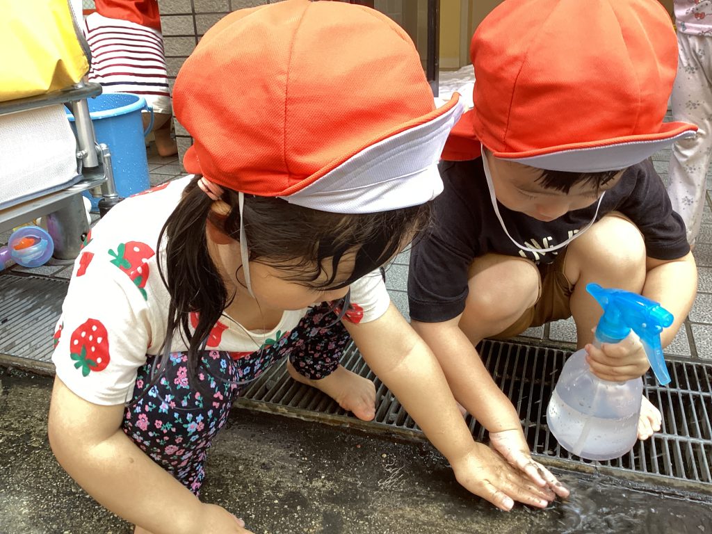 ジョウロを使って水を移し替えたり、水鉄砲でお友だちや先生に掛け合って遊んでいます😄