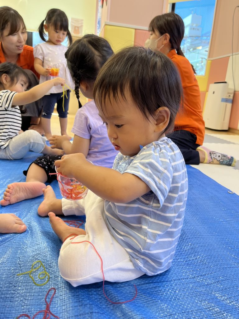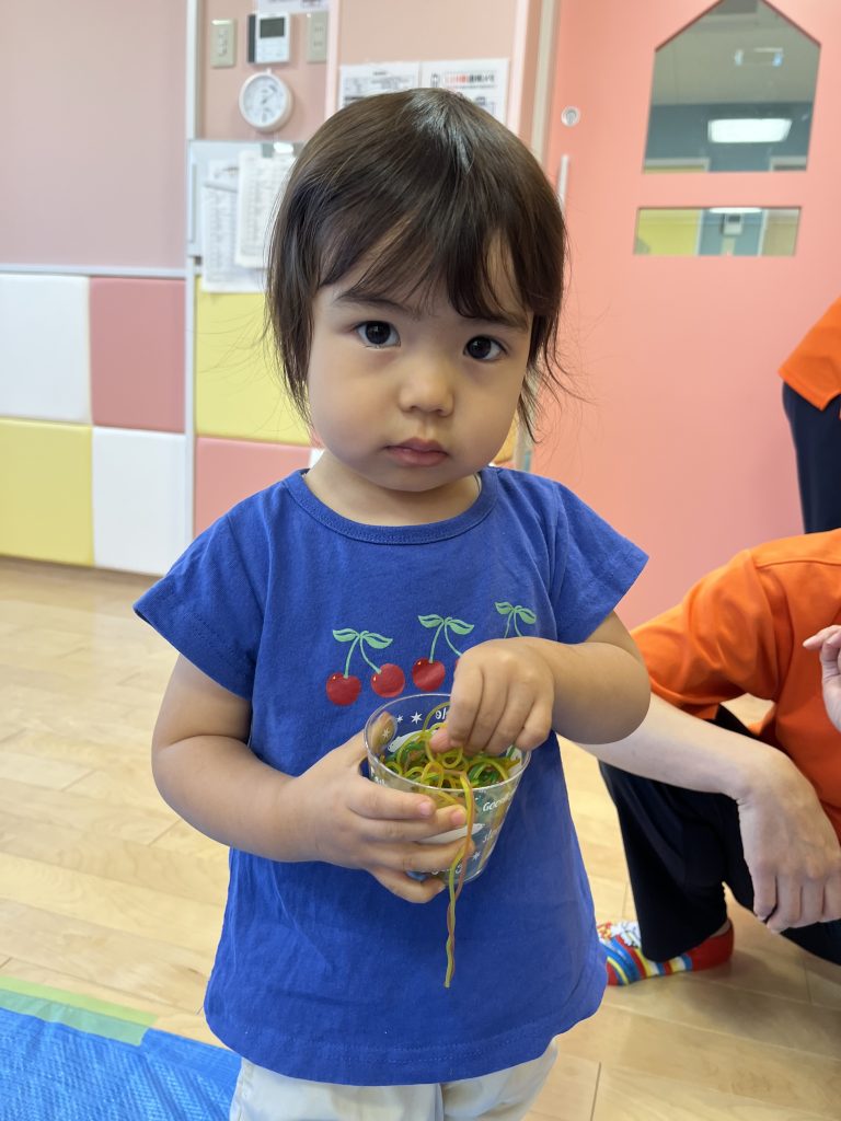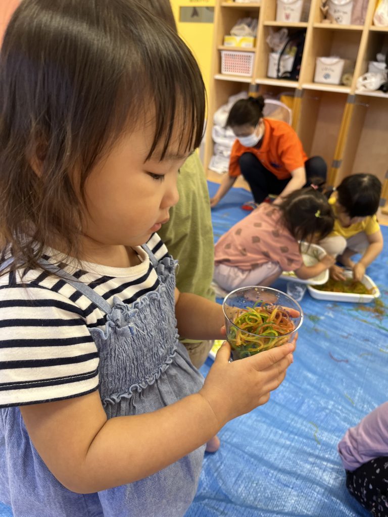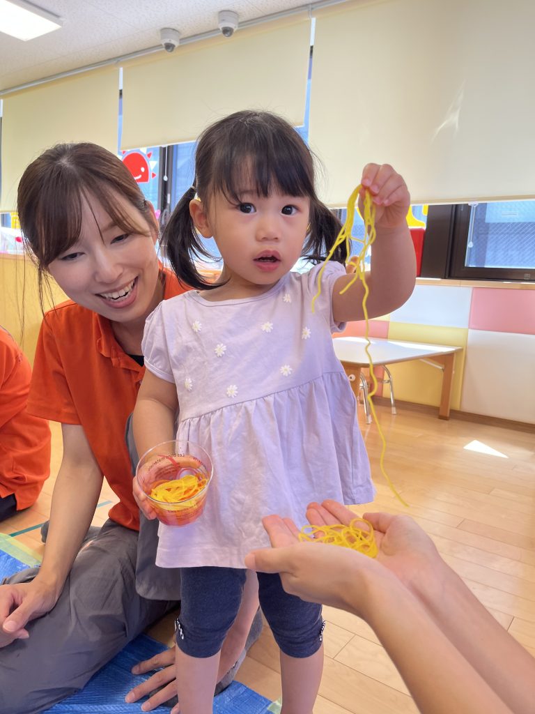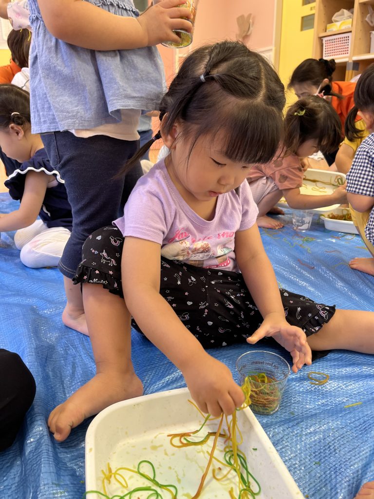 春雨遊びでは赤色、オレンジ、黄色、緑色に染まった春雨を触ったり、カップに入れて遊びました!