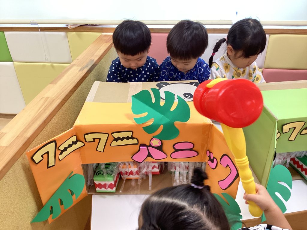 「怖いよ〜」と言うお友だちもいましたが、先生と一緒にピコピコハンマーでやっつけました💥
