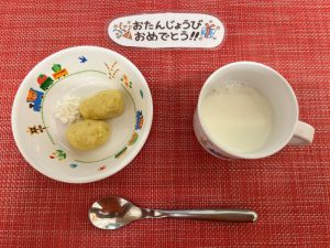 お友達と先生に「お誕生日おめでとう!」と、お祝いしてもらいニッコリ笑顔が見られました♪ これからも、たくさん食べて、遊んで、楽しい時間を過ごそうね♪
