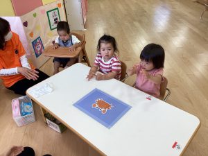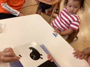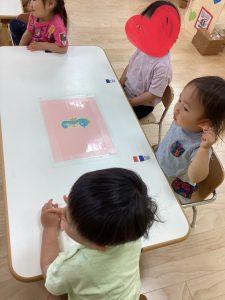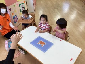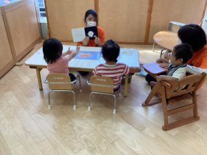 絵本のイラストを見ながら「ホワイト!」「ブルー」「レッド」と先生に色を英語で教えてもらいましたよ?