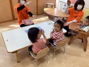 先生が手でパチパチとサメの真似をすると自然と子どもたちもサメの真似っこを始めます!