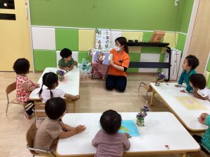 落ち着いた時間を設けることで、子どもたちが一日の活動に入りやすいように朝の会の前に絵本を読んでいます✨また、活動の合間には必ず絵本タイムがあります!!