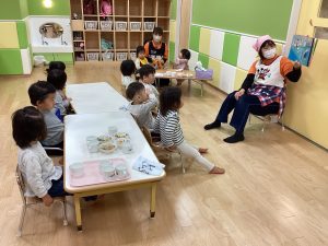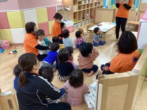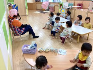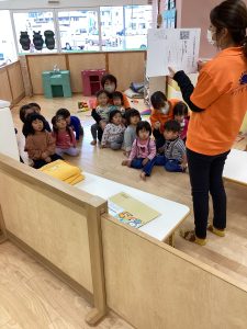 地震からの火災でみんなで避難をした後に先生から地震の紙芝居を読んでもらいました。