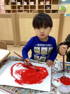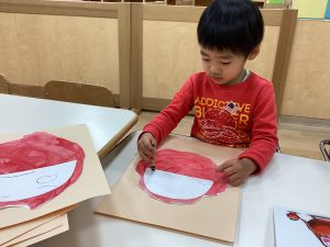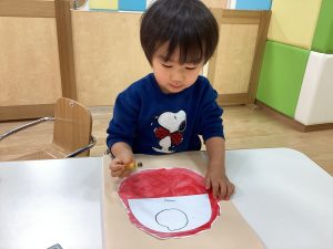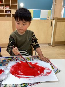 赤色の絵の具でくるくるだるまの形を描いていきます✨