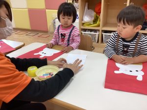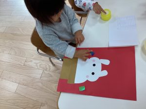 うさぎさんの鏡餅に目やほっぺをシールで貼って完成‼︎