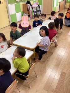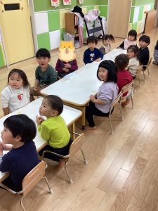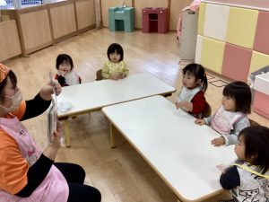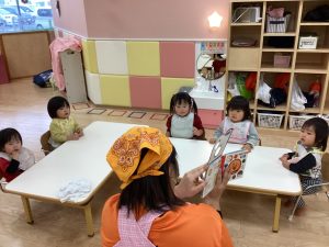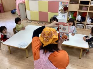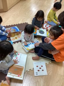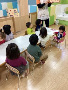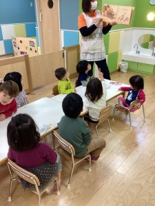 朝の会の前やおやつの前、給食の前など活動の前に絵本を読んで心を落ち着かせ、次の活動に移ります😊