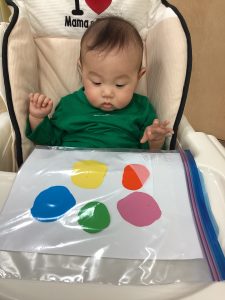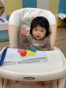 ジップロックに画用紙と絵の具を入れて感触遊びの延長で製作をしました❤️