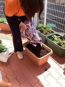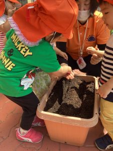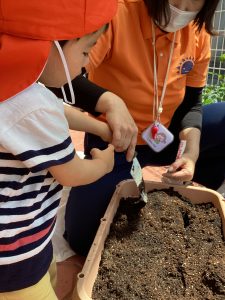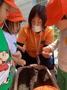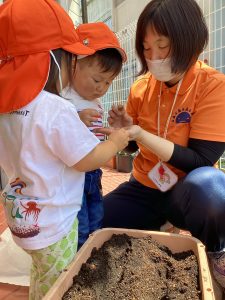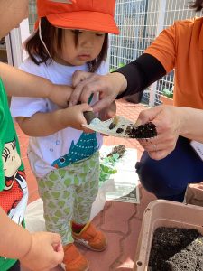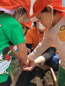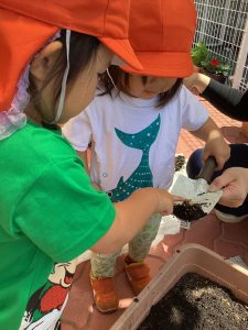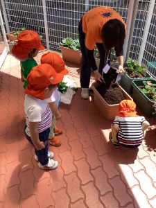 サンライズキッズ保育園では、2歳児中心に食育の一環として植栽をしています。