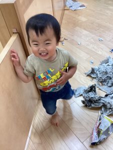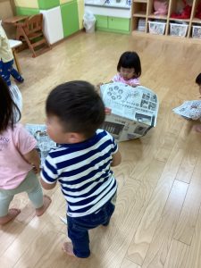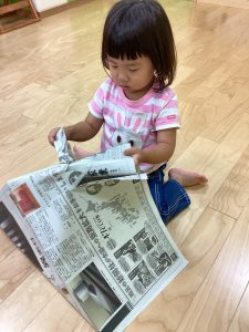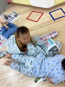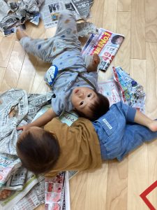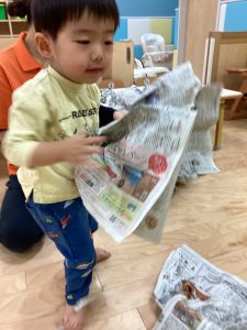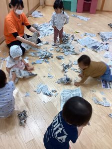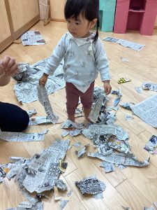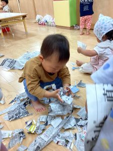 新聞をビリビリに破って感触遊び⚡️