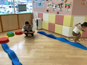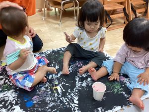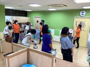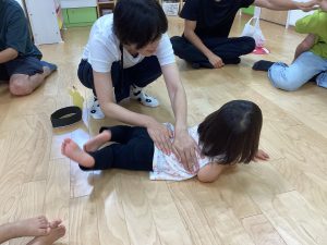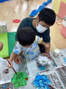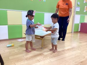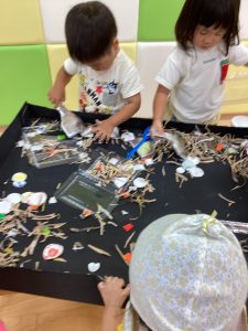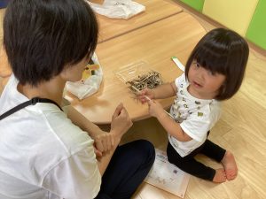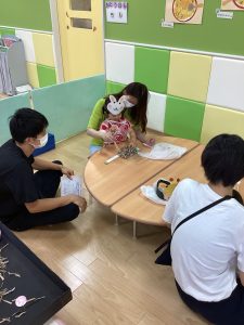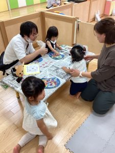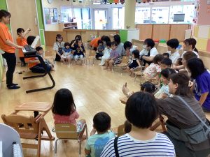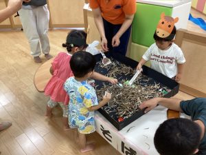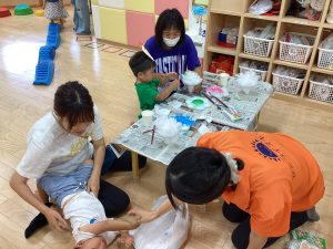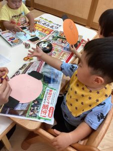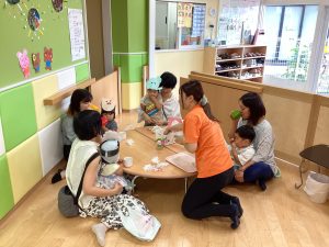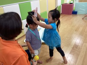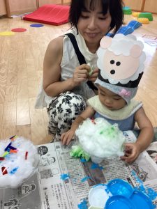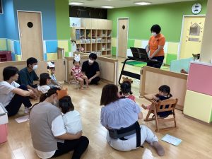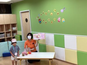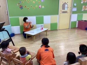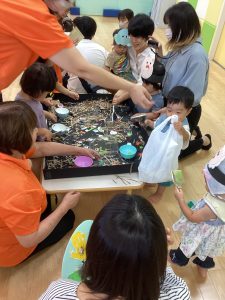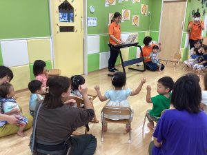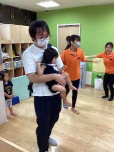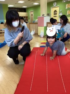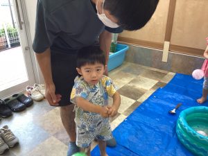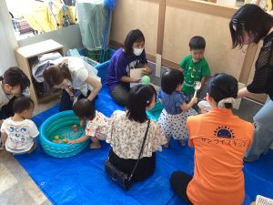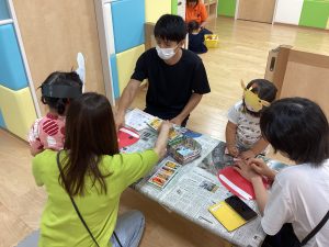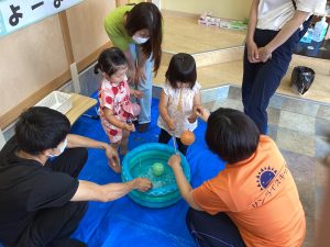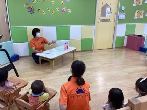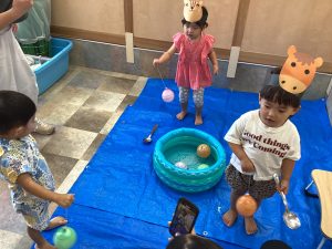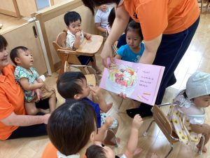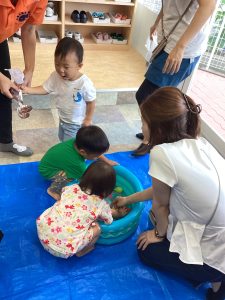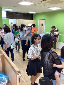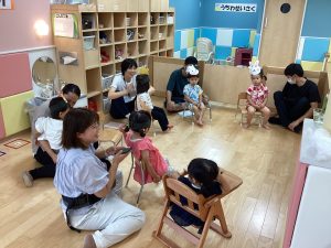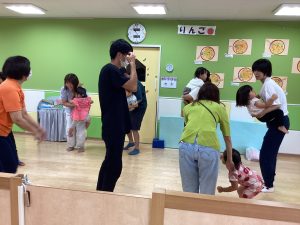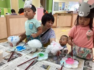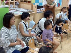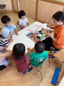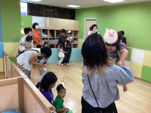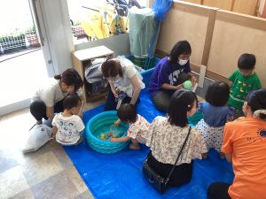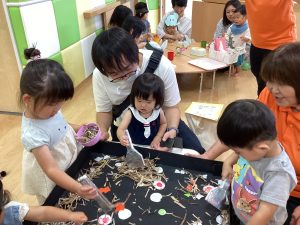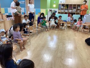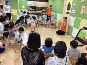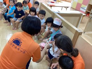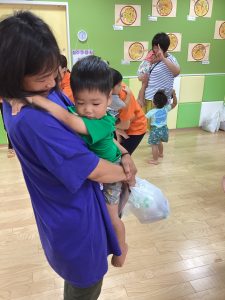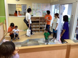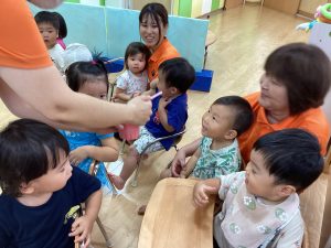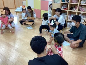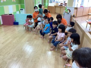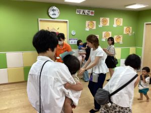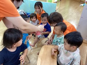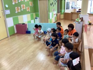 異年齢交流を交えて前日に夏祭りに参加した2歳児クラスのお兄さん、お姉さんは