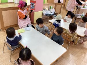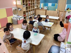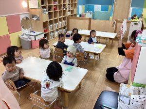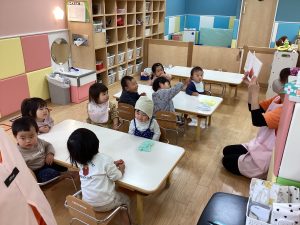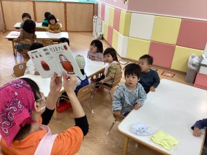 1歳児いちご組・0歳児もも組の絵本読み聞かせの様子です!!