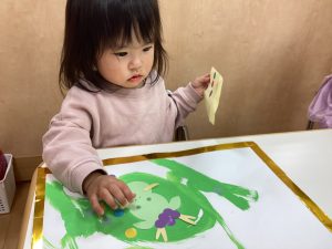 自分たちで考えてお皿に野菜や果物を盛り付けて食べるまね事や、
