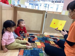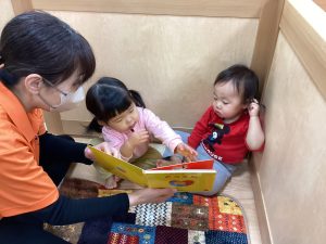 もも🍑組さんは「とっくん」の絵本を見ましたよ😊絵本の絵をじっと見ています。時に、指さしをする様子も見られました。