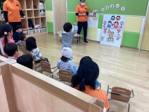 ひな祭り会では、おひなさまの由来を聞き、絵本を読んでもらいました。その後、みんなでお雛様やお内裏さま、花や菱餅、3人官女などの飾り付けをしました。