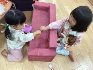 お姉ちゃんと一緒に仲良くポポちゃんの人形にミルクを飲ませて遊んでいます😊微笑ましいですね。