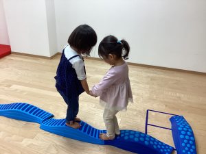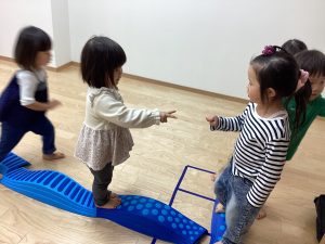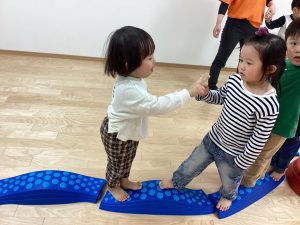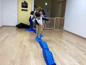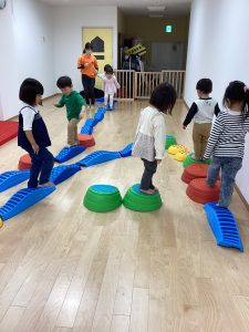 サーキット遊びの様子をお伝えします。最近では、平均台や丸い飛び石などみんなで運び、自分たちでコースを考えて楽しんでいます。また、順番に並び待てるようにもなりました!