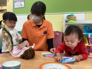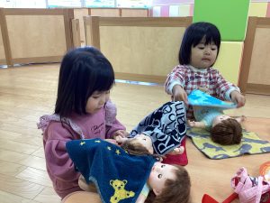 いちご組さんも最近は、ぽぽちゃんの人形を使ってままごと遊びに夢中です。ミニタオルを布団に見立ててぽぽちゃんを寝かしています!