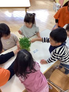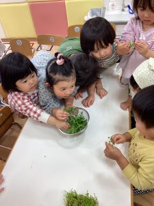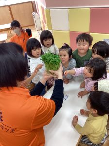 次は豆苗に触れました。豆苗にも興味津々な子どもたちです。まずは
