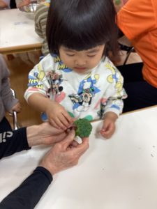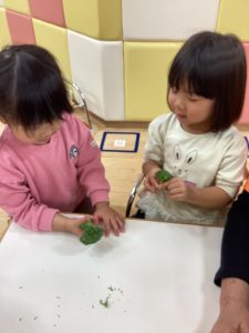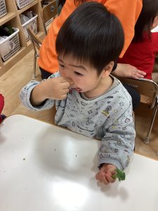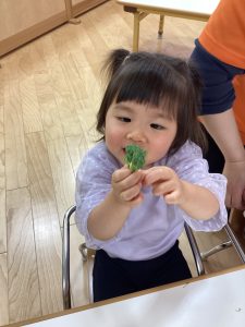 みんなでブロッコリーに触れて、小さく割いてからりんご🍎組のお友だちが給食の先生に「お願いします😄」とブロッコリー🥦を渡しに行ってくれましたよ。