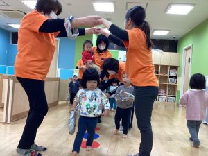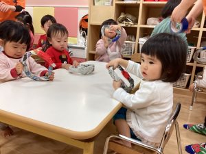 「たのし〜😆」とみんなハンドルを動かしながら楽しそうです。先生たちがトンネルを作ってくれて、トンネルを潜って楽しみました。