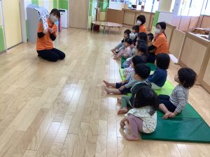 いつもは、各クラスに分かれて絵本を見ているのですが、今日はみんなで一緒に仲良く見れました✨サンライズキッズ保育園では毎日、たくさんの絵本の読み聞かせをしています。子どもたちも『これ、読んで〜』と保育者に読んでもらうのを楽しんでいます😊これからも、いろんな絵本に触れていきたいと思います。以上、今回の絵本ブログでした。