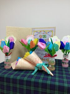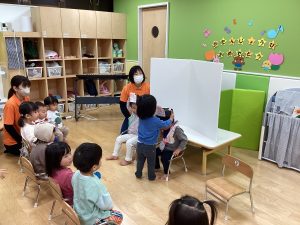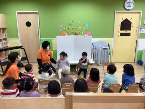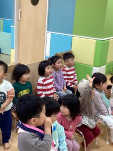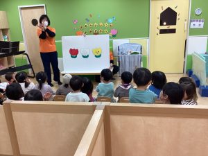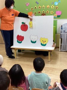 今回の保育者からの出し物はパネルシアターです。チューリップ🌷が出てくると「チューリップだ〜、かわいい😍」と言ってくれたお友だちもいました。チューリップ🌷の歌をみんなで歌いました♪