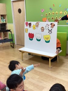 チューリップのお花の中から、動物さんが登場すると、大興奮の子どもたちでした(笑)。友だちや自分のマークの動物が出てくると「〇〇ちゃんのマークと一緒だ〜😆」と声に出して言っていました。