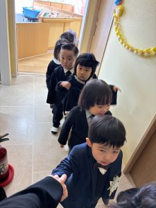 次は卒園式の様子をお伝えします。今月に入ってから、少しずつ練習をしてきました。初めは、順番に並んで歩くことも難しい時もありましたが、練習を重ねることで、1列になり、並んで歩けるようになりました😊